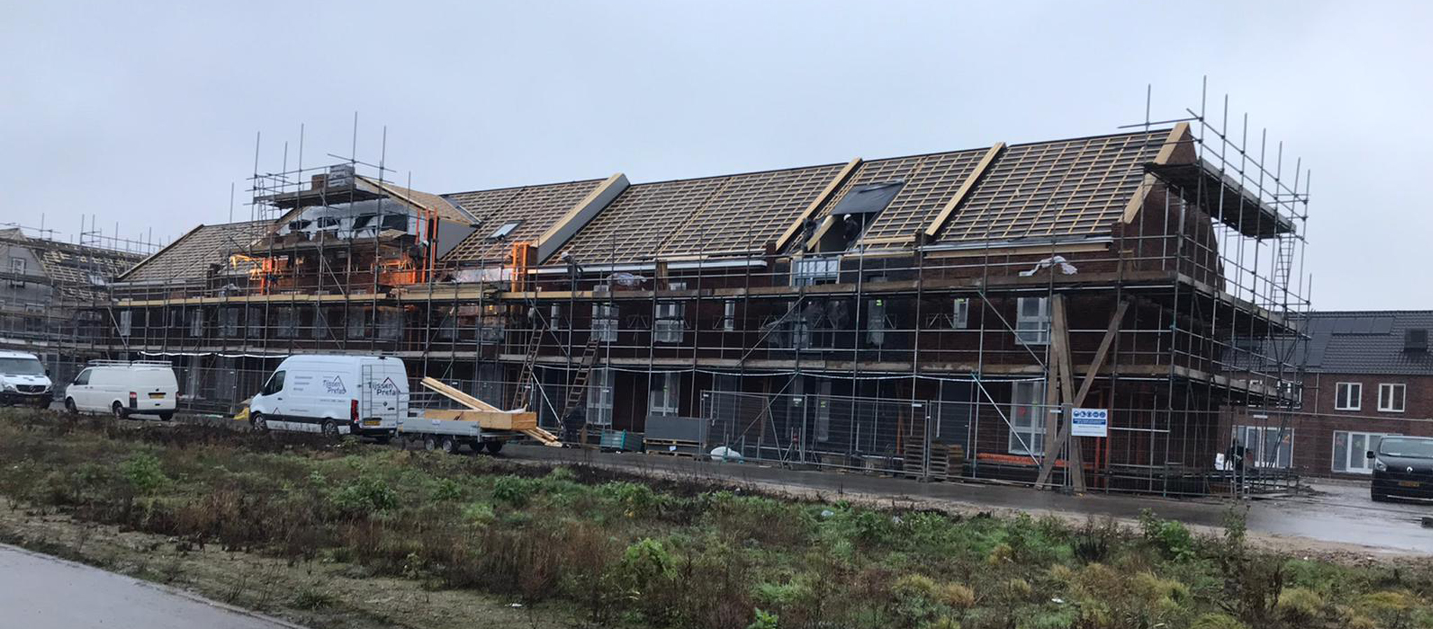 Wellicht ben je al langs de bouw gereden en heb je kunnen zien dat bij de eerste blokken het metselwerk al redelijk is gevorderd en de kappen zijn gelegd. Op deze wijzen ontstaat een bouw trap. Bij de volgende blokken volgen dan trapsgewijs de zelfde activiteiten. Na het leggen van de kappen start ook de afbouw van de woning. Als eerste worden de trap en de binnenwanden aangebracht. Hierna volgen E en de W Installatie, cementdekvloer, tegelzetter en de stukadoor. Het streven van de aannemer is om de eerste blokken voor de kerst uit de steigers te halen.